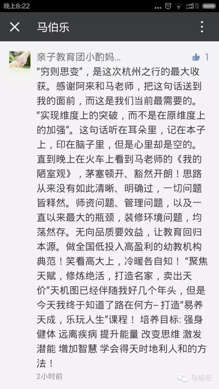 ……直到晚上在火车上看到马老师的《我的陋室观》,茅塞顿开、豁然开朗!思路从来没有如此清晰、明确过,一切问题皆释然。师资问题、管理问题,以及一直以来最大的瓶颈,装修环境问题,均荡然无存……向品质要效益,让教育回归本源。做全国低投入高盈利的幼教机构典范!笑看高大上,冷暖各自知!