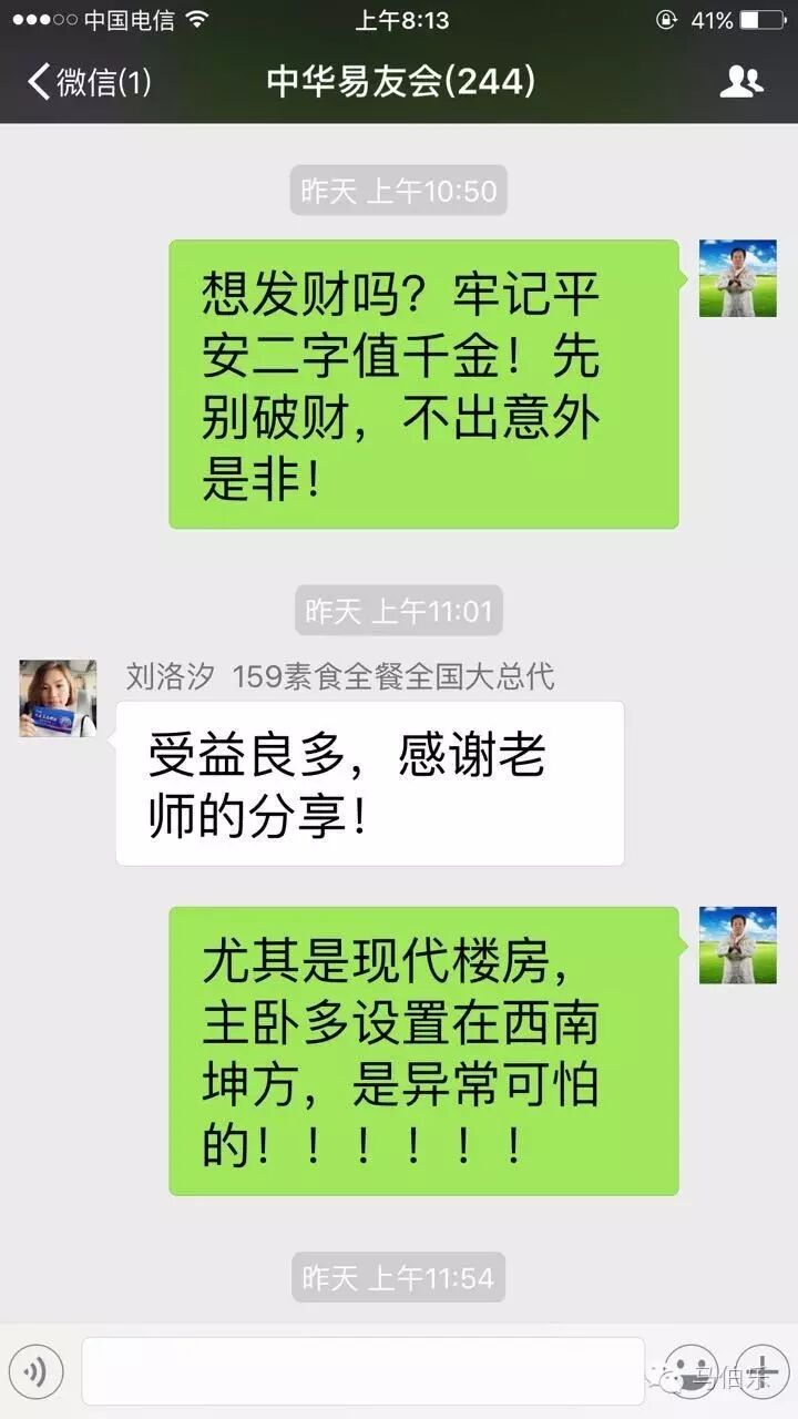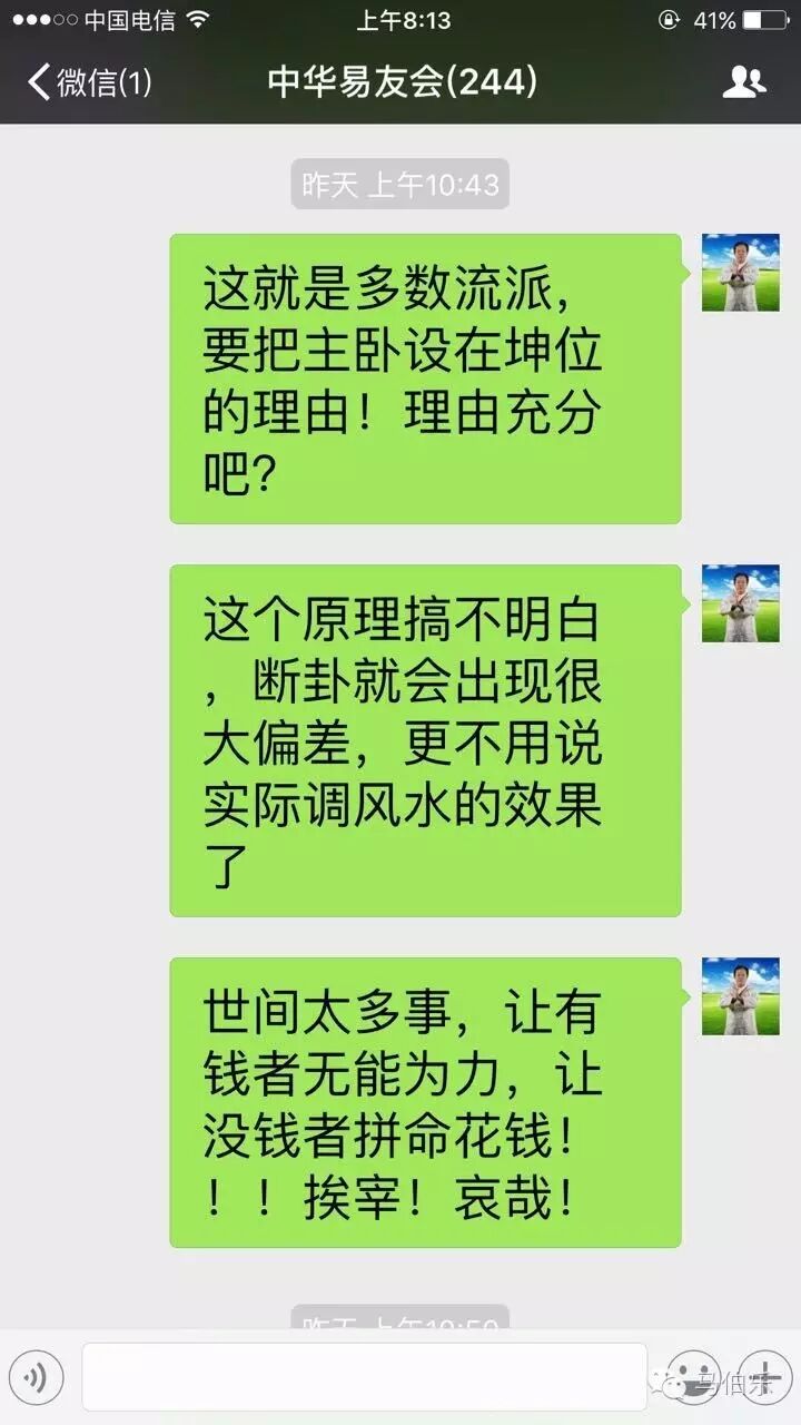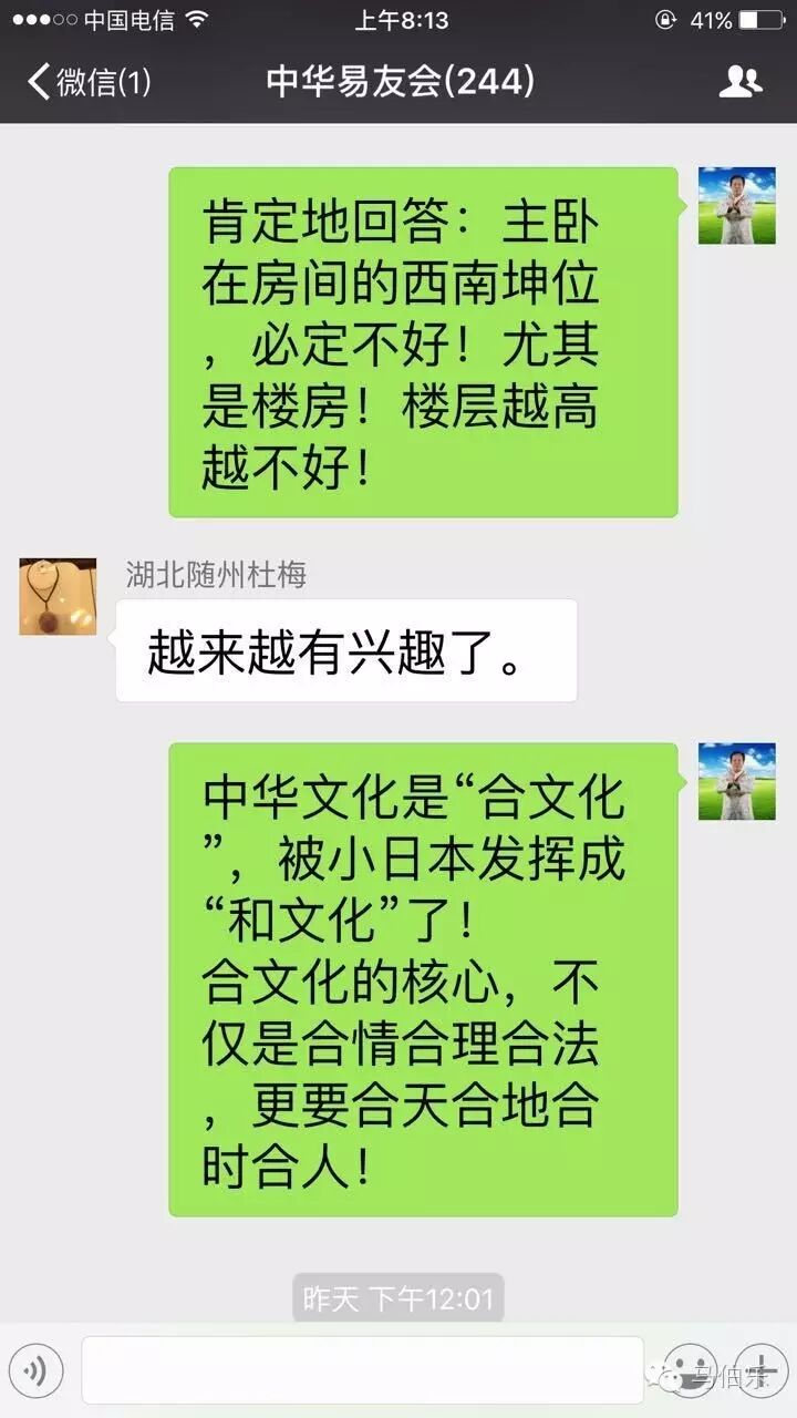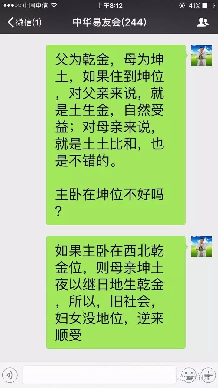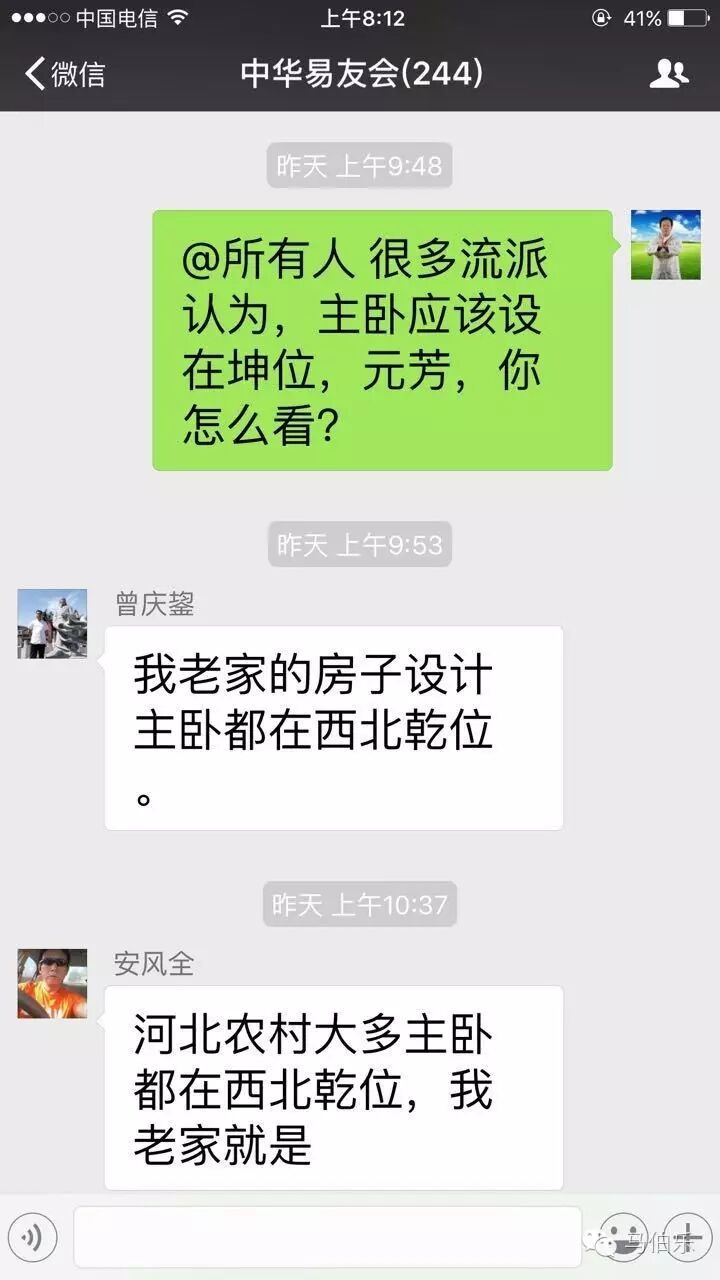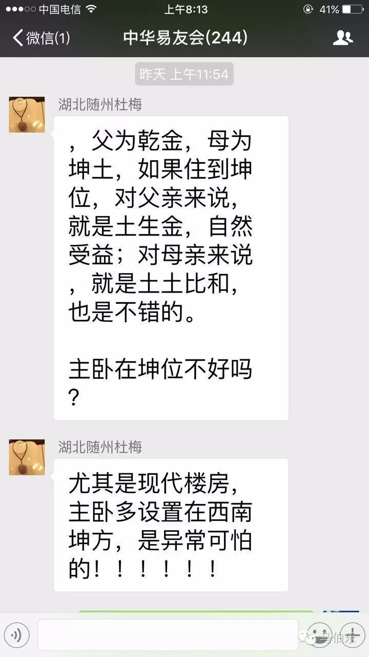 【314】主卧应该放在哪个房间 2 2,393 点击 A+所属分类:实战经验 收 藏原创 2016-09-13 马江龙 玄极文化 有朋友咨询: 家里的主卧,应该放在哪个房间? 卧室,是家庭中最重要的位置所在,因为每个人几乎1/3的时间,都是在床上度过的,关乎每个人的健康和运气。 所以,我在“中华易友会微信群”里,就这个问题,发起了讨论。 整个过程截图如下: 横看成岭侧成峰,远近高低各不同; 不识庐山真面目,只缘身在此山中。 如果,这篇文章,能引发您的某些思考,那么,我也就欣慰了。 我的微信 这是我的微信扫一扫 我的微信公众号 我的微信公众号扫一扫 赞 8 赏 分享